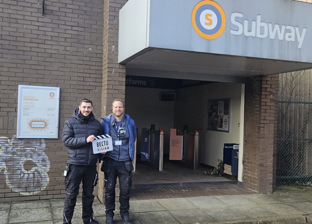 Ryan and Bobby in front of Shieldinch subway station, on set at River City